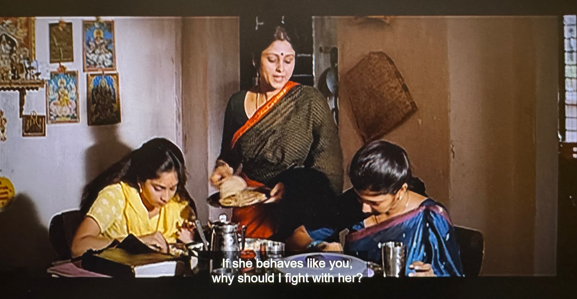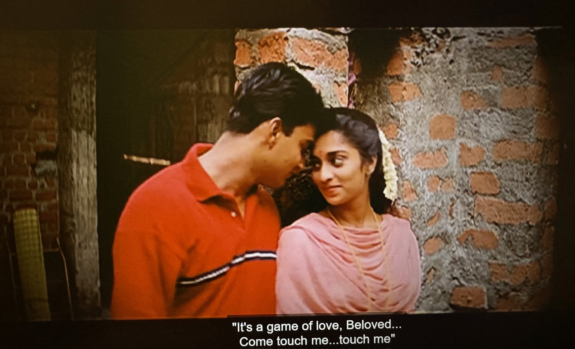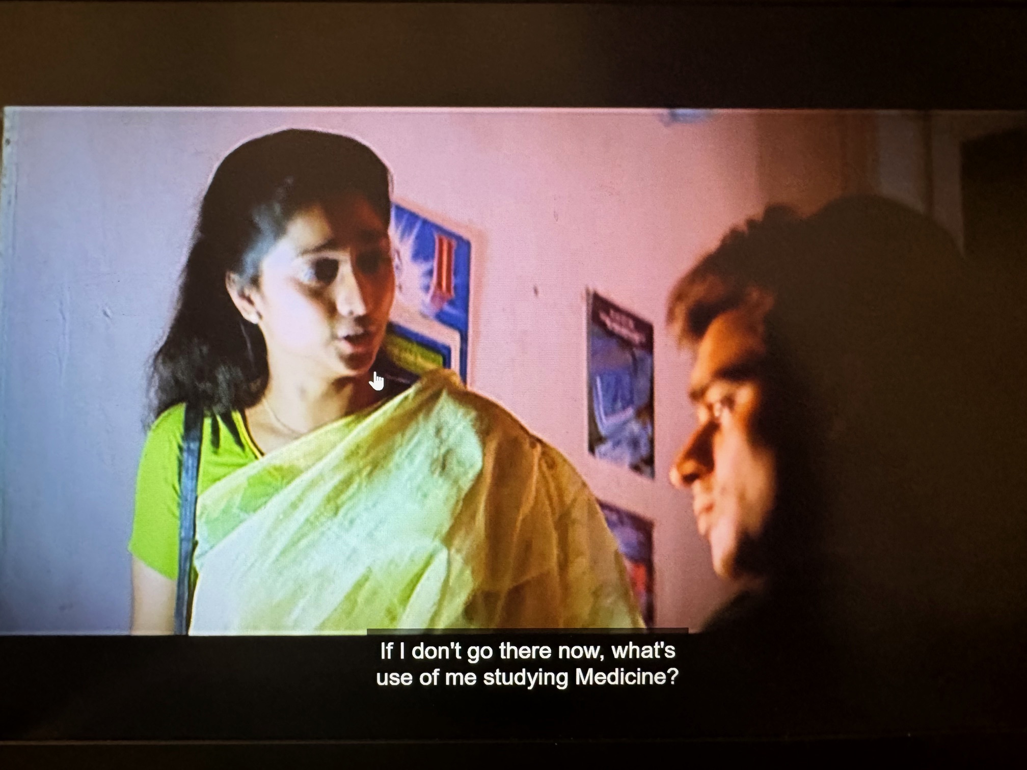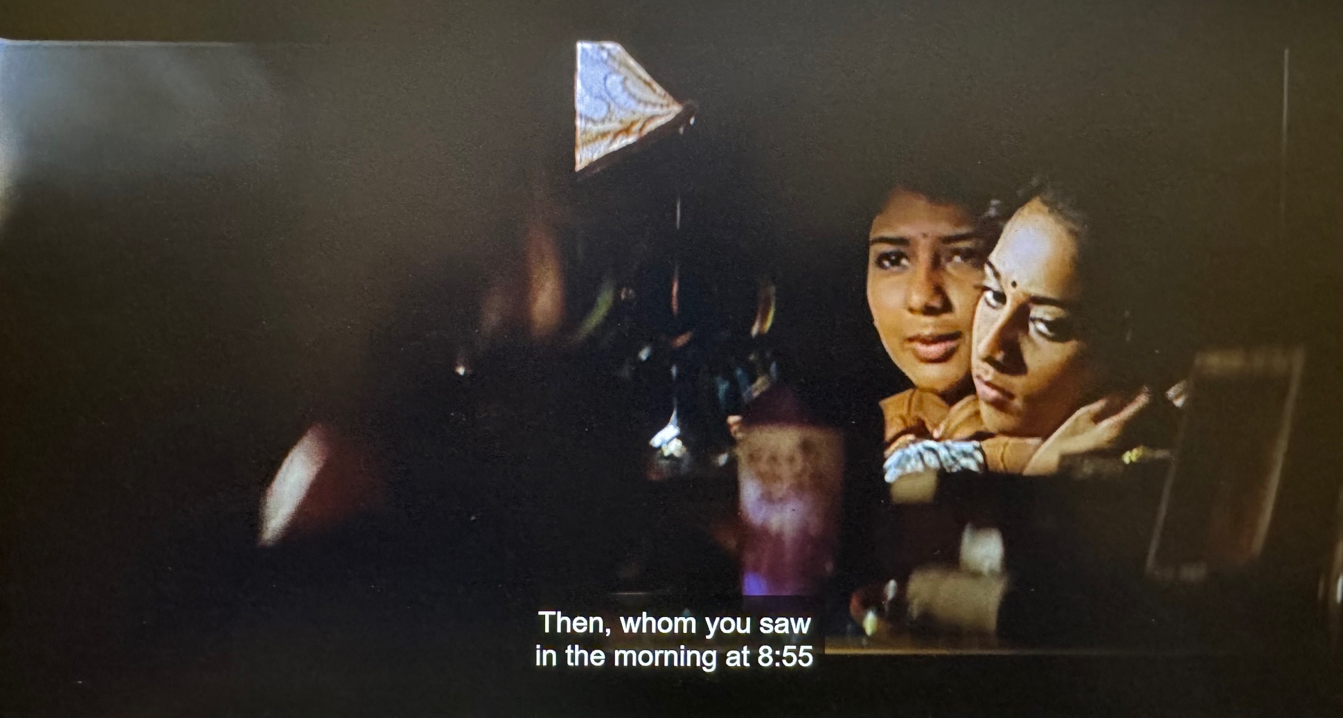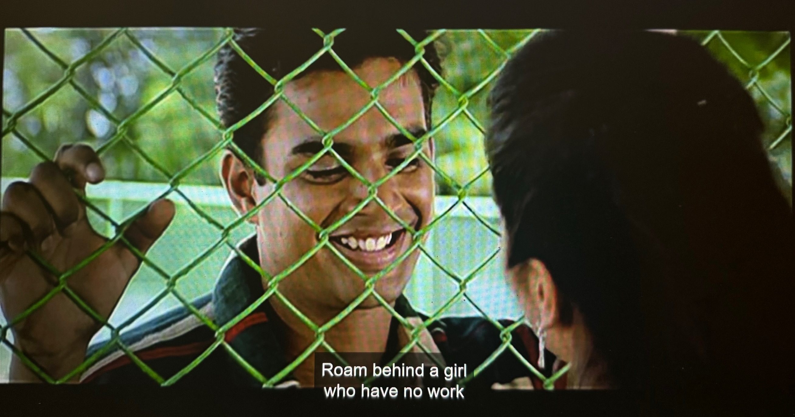 Yet, they don’t live the same life and they don’t have the same freedom. Shakthi is a middle class young woman who mostly navigates between her medical college and her house, and who is mostly shown, in the first half of the film, inside her house, in her room, talking to her sister. Thus, multiple frames within frames trap her behind the bars of her bed, in the mirror of her room, because how free could be this middle class young woman in the late 1990s ? On the contrary, Karthik is an upper class young man who is often outside his house, tinkering his software company with his father’s money, playing basketball with his friends.