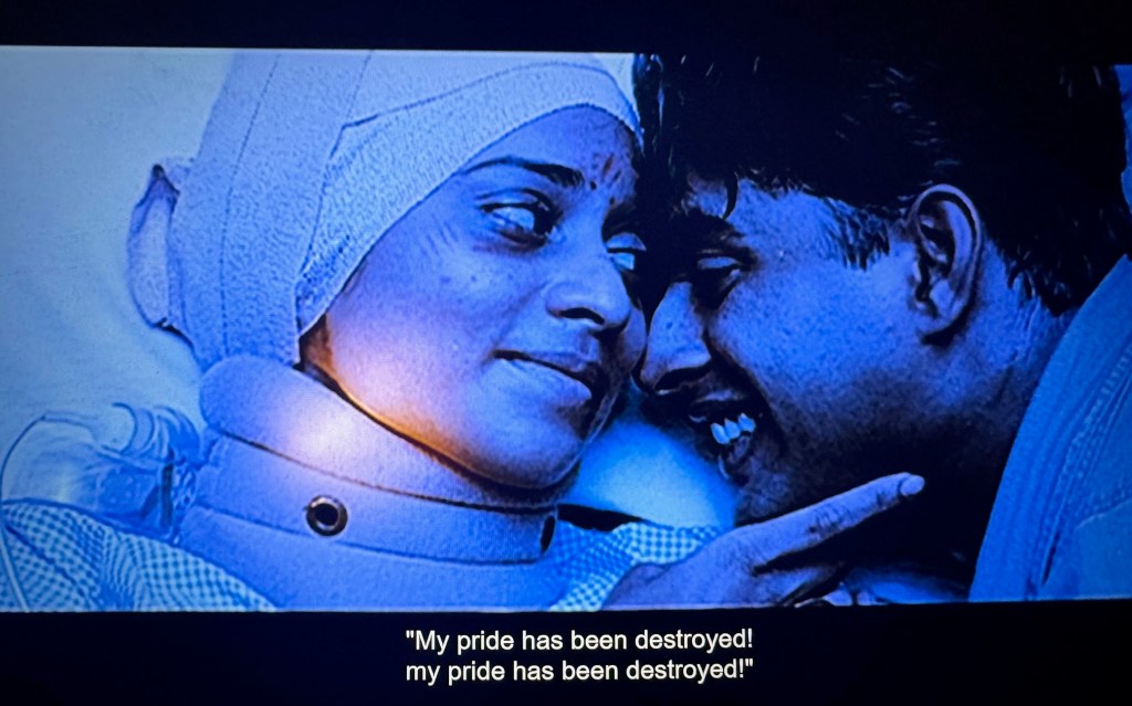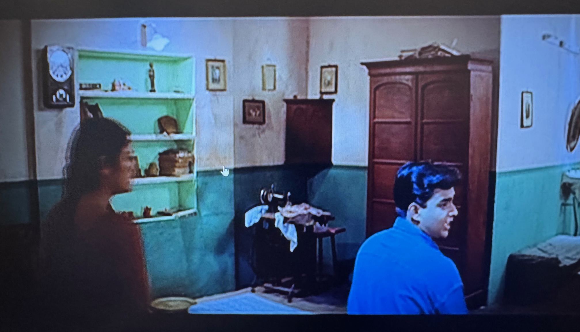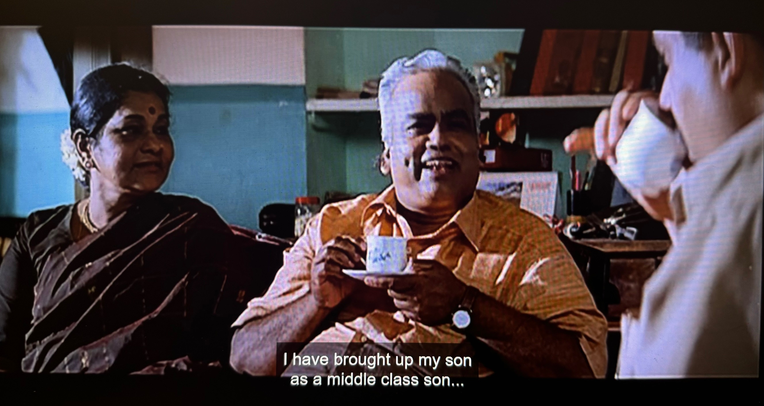 In that sense, the acme could be the meeting of the families. The whole scene is brilliantly written and staged in crescendo, slowly intensifying the social conflict, especially between the fathers who have opposite class consciousness, and are mostly shown in shot-reverse shot. Karthik’s father is a rich criminal lawyer, very conscious of his social status (think about how he points out the fact that his son shares echa cigarettes with his friends), often very ironical in his language. Shakthi’s father is a railway employee, who, from the beginning, is shown very protective with his daughters, but also very straightforward. In the whole conversation, class consciousness is at stake : while the first one (falsely) says that he raised his son like a middle-class paiyan, the second one (proudly) says that he raised his daughters like maharanis. Note the precision of Mani Ratnam’s writing and characterization. Like an occupational bias, the lawyer is obviously passive-aggressive, expressing his class pride and pointing out the middle-classness of Shakthi’s family : he says that all the houses look the same in this colony, he compares Shakthi to “road la pora oruthi”, he asks Poorni if she will also have a love marriage to save her parents money. On the contrary, after responding maliciously to some of these verbal attacks, the straightforward railway employee is the one who breaks this passive-aggressive flow by firmly verbalizing the floating class conflict : “Sir enna solla varinga, neenga panakaarangalum, naanga pichakaarangala”. Interestingly, Karthik’s father responds by denying the social issue in their conversation and making it a personal feelings issue : “unga inferiority complex, en superiority complex pathi pesa varla”. As if Shakthi’s father had paved the way of the of the counter-attack, Shakthi outbursts after him, and finally, her mother closes the discussion by referring to their family pride. I always wondered why Karthik was absent in this crucial moment, but now I know that his presence would have change the balance and the meaning of this whole scene in the plot.