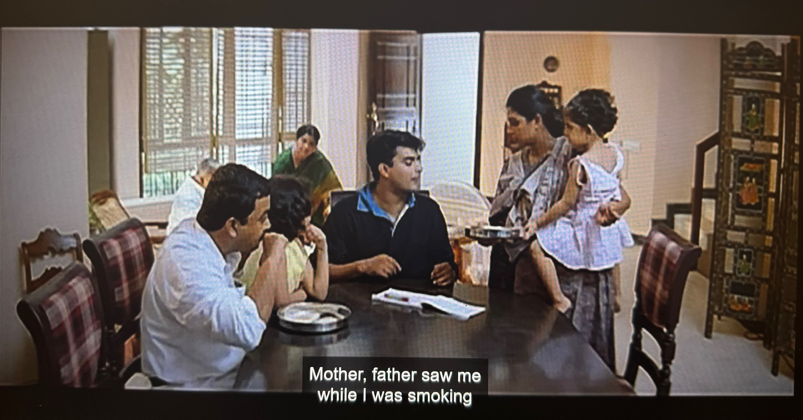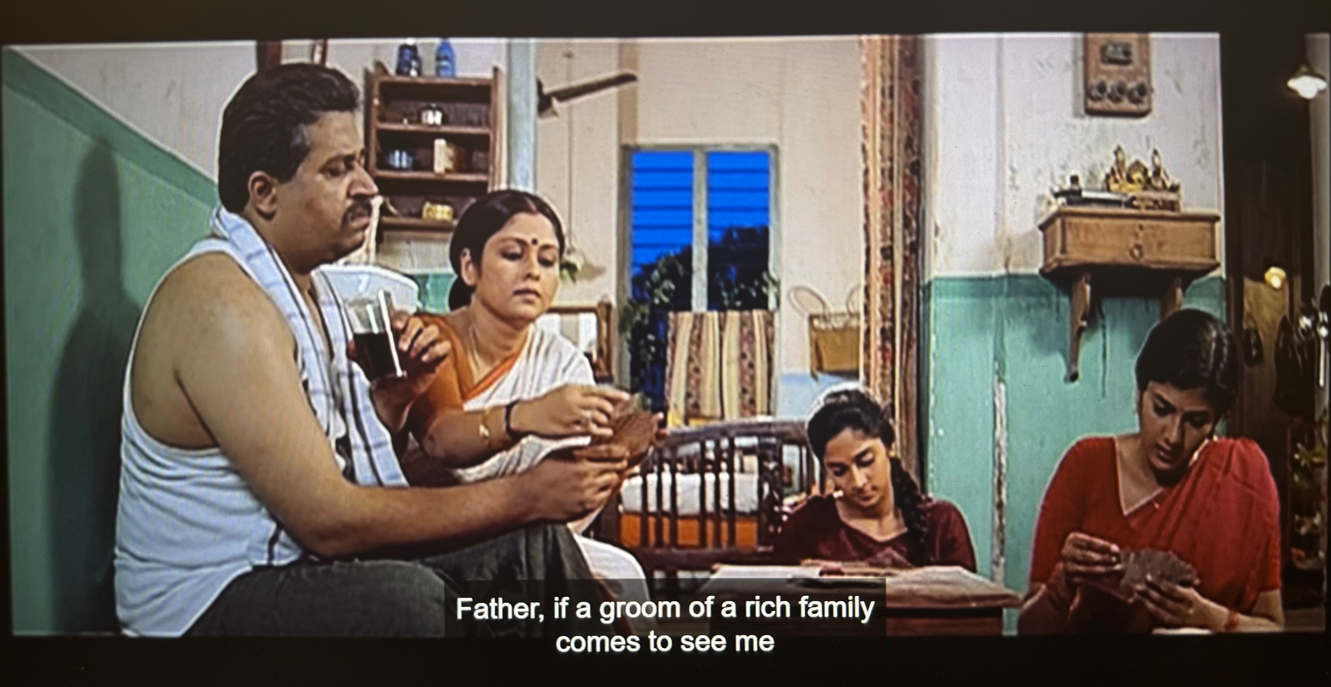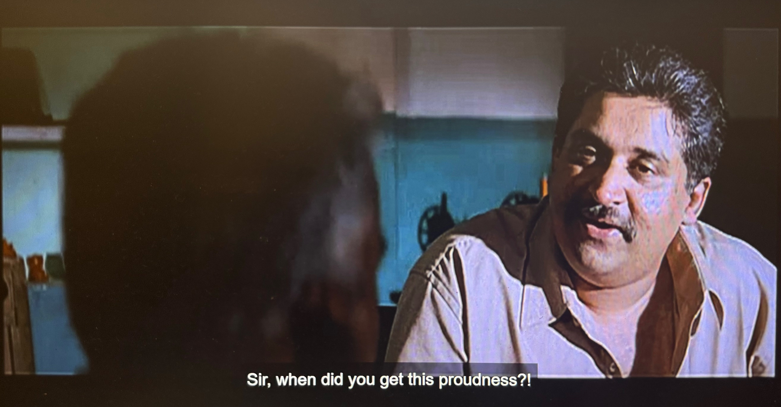 In that sense, the acme could be the meeting of the families. The whole scene is brilliantly written and staged in crescendo, slowly intensifying the social conflict, especially between the fathers who have opposite class consciousness, and are mostly shown in shot-reverse shot. Karthik’s father is a rich criminal lawyer, very conscious of his social status (think about how he points out the fact that his son shares echa cigarettes with his friends), often very ironical in his language. Shakthi’s father is a railway employee, who, from the beginning, is shown very protective with his daughters, but also very straightforward. In the whole conversation, class consciousness is at stake : while the first one (falsely) says that he raised his son like a middle-class paiyan, the second one (proudly) says that he raised his daughters like maharanis. Note the precision of Mani Ratnam’s writing and characterization. Like an occupational bias, the lawyer is obviously passive-aggressive, expressing his class pride and pointing out the middle-classness of Shakthi’s family : he says that all the houses look the same in this colony, he compares Shakthi to “road la pora oruthi”, he asks Poorni if she will also have a love marriage to save her parents money. On the contrary, after responding maliciously to some of these verbal attacks, the straightforward railway employee is the one who breaks this passive-aggressive flow by firmly verbalizing the floating class conflict : “Sir enna solla varinga, neenga panakaarangalum, naanga pichakaarangala”. Interestingly, Karthik’s father responds by denying the social issue in their conversation and making it a personal feelings issue : “unga inferiority complex, en superiority complex pathi pesa varla”. As if Shakthi’s father had paved the way of the of the counter-attack, Shakthi outbursts after him, and finally, her mother closes the discussion by referring to their family pride. I always wondered why Karthik was absent in this crucial moment, but now I know that his presence would have change the balance and the meaning of this whole scene in the plot.