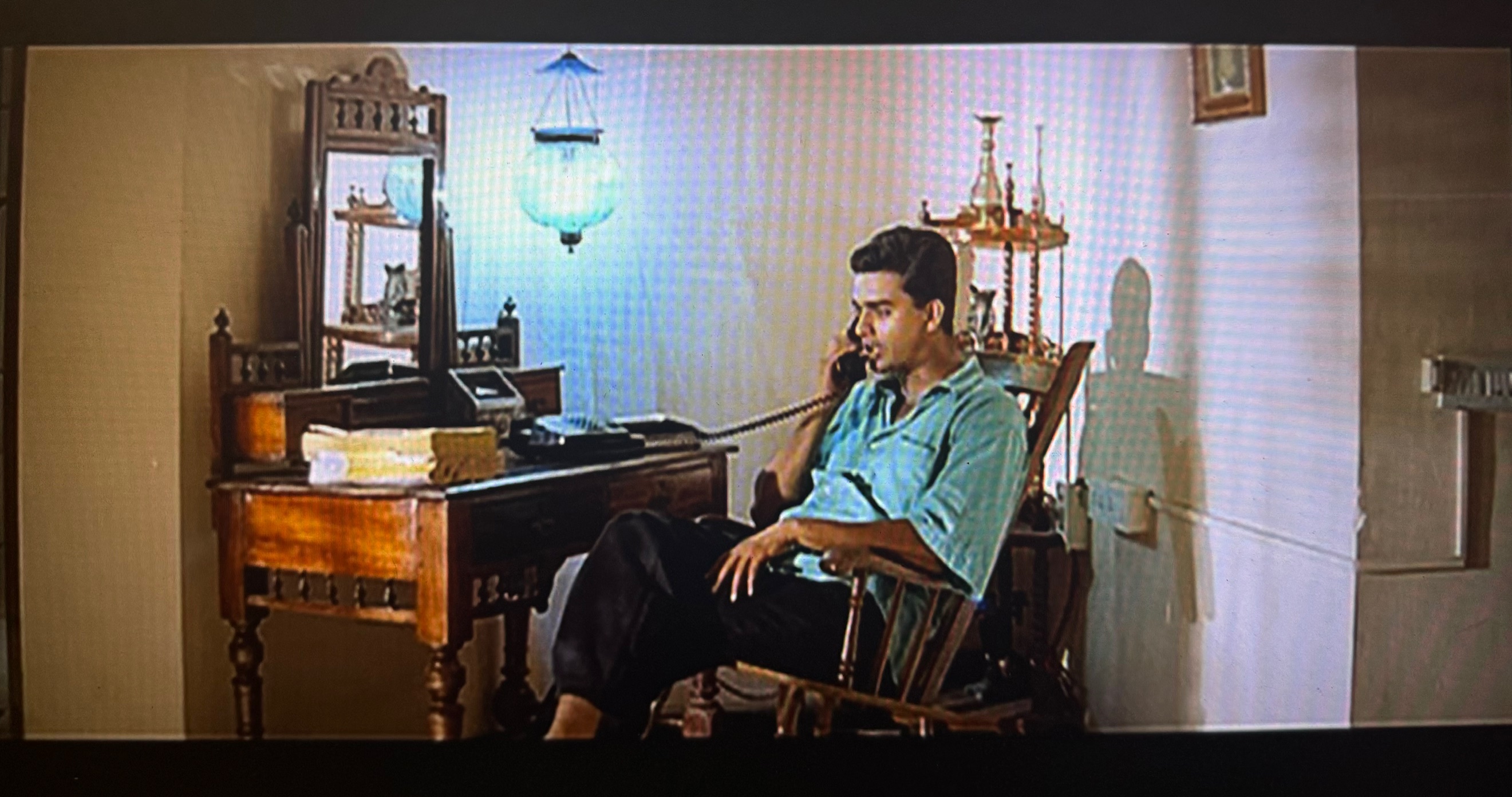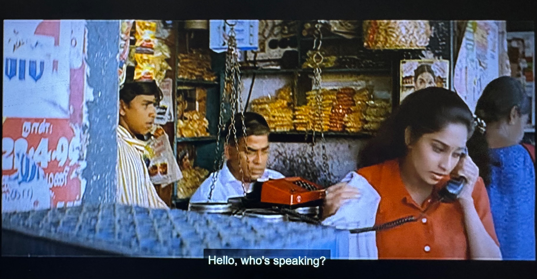 After that, throughout the first half of the film, Mani Ratnam uses different elements to visually stage the social issue beneath the love story. For instance, the phone call scenes clearly depict the contrasting lives of the protagonists, especially the first one that use medium shots to show each character in their environment. While Shakthi has to attend the call in a malligai kadai, surrounded with street and shops noises, Karthik is sitting in a rocking chair in the silent comfort of his house.